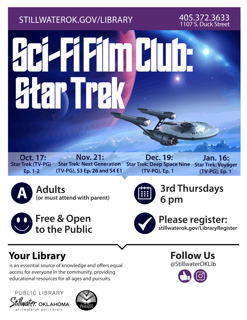 The Stillwater Public Library’s (SPL) long-running science fiction film club will kick off a new series in October featuring various iterations of “Star Trek.” Attendees will screen the first episodes of four different shows on the third Thursday of each month at 6 p.m., starting on Oct. 17.